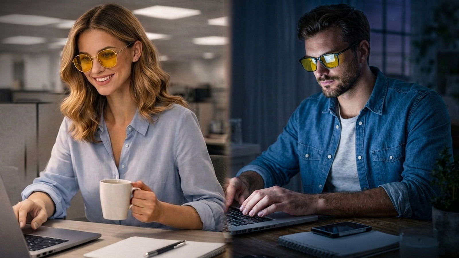 Amarillo (dia) — Ideal para trabajar frente a pantallas. Reduce la fatiga visual sin afectar tu estado de alerta.